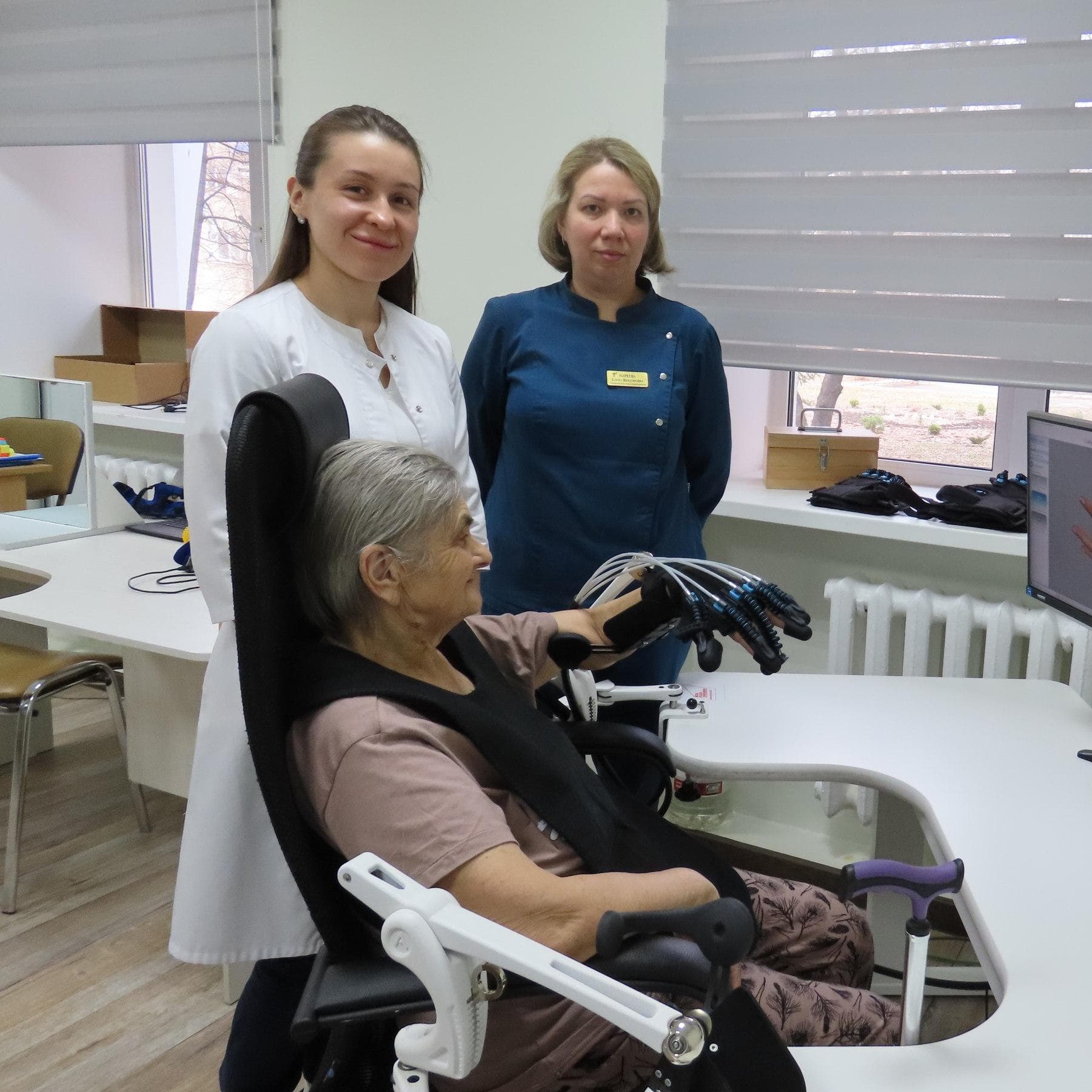 «Моя задача - адаптировать пациентку к тем условиям, в которых она сейчас находится. Когда она научилась самостоятельно передвигаться, следующий её запрос заключался в восстановлении функции пораженной руки. Мы работаем над этим с помощью тренажера с биологически обратной связью «перчатка Глория», стараемся восстановить по максимуму движения в руке», - добавляет Елена Мареева, эрготерапевт.