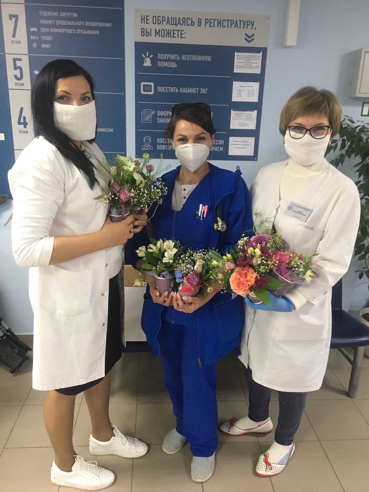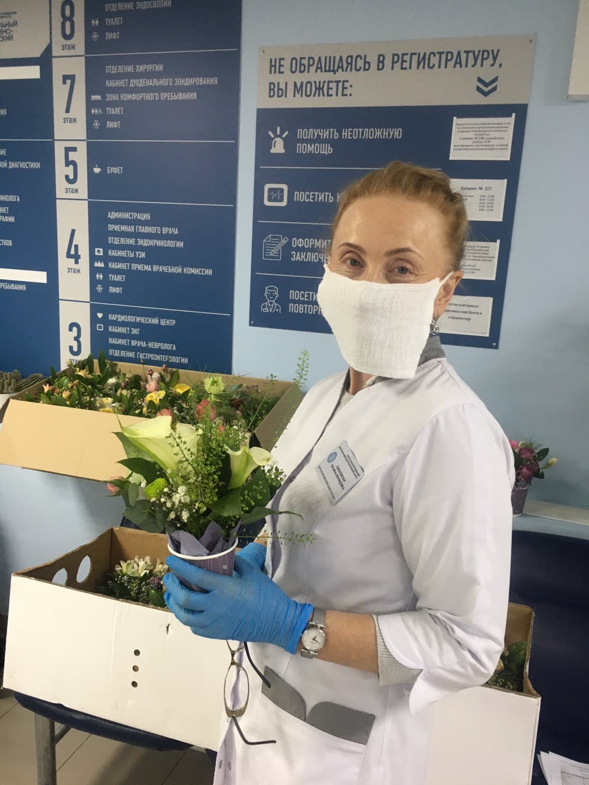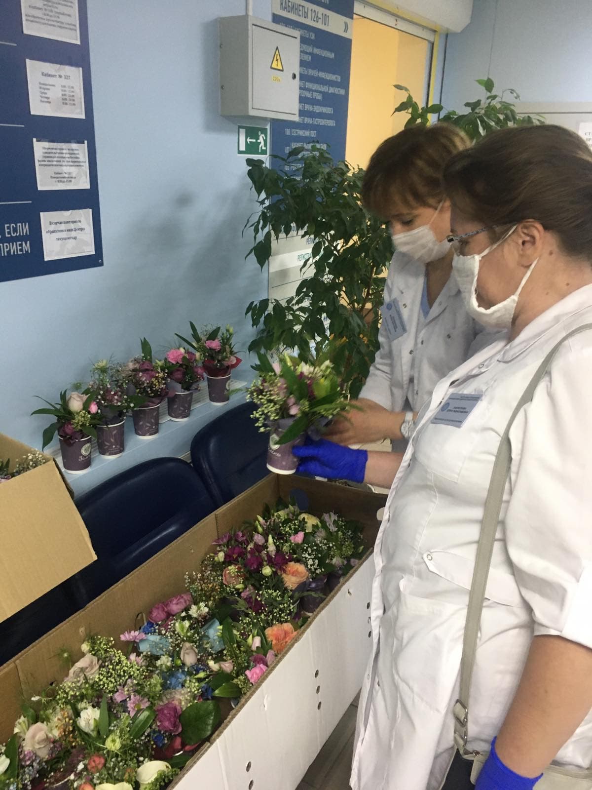 Небольшие букетики, помещающиеся в кофейный стаканчик, передали сотрудникам, работающим в зелёной/желтой и красной зоне КТ-диагностики и в лаборатории, разместили в регистратуре и кабинетах врачей.